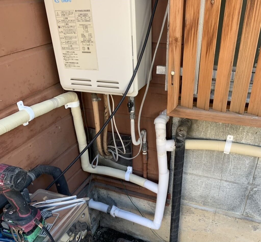 今回は屋外給湯器の配管から滲むぐらいの水漏れがあるので、見に来てほしいとご依頼をいただきお伺いさせていただきました。